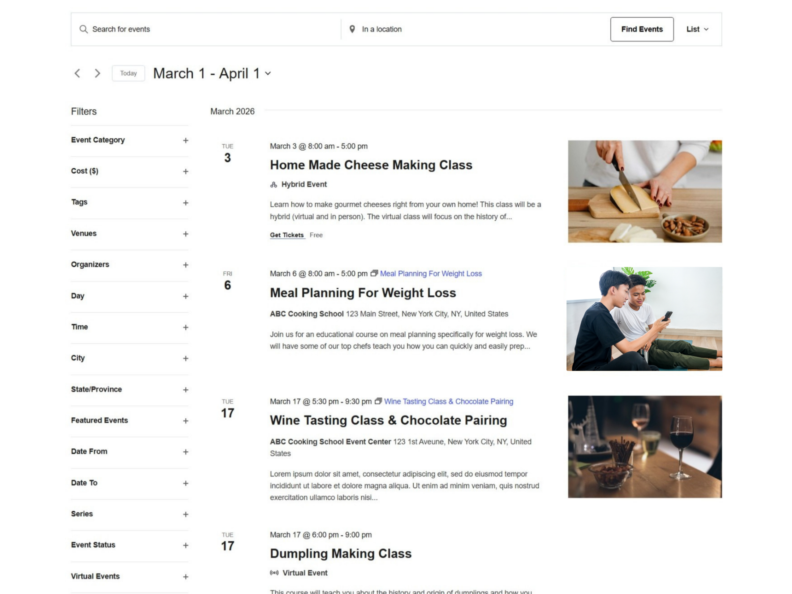 Filters let users search events by category, venue, organizer, day of the week, and more.