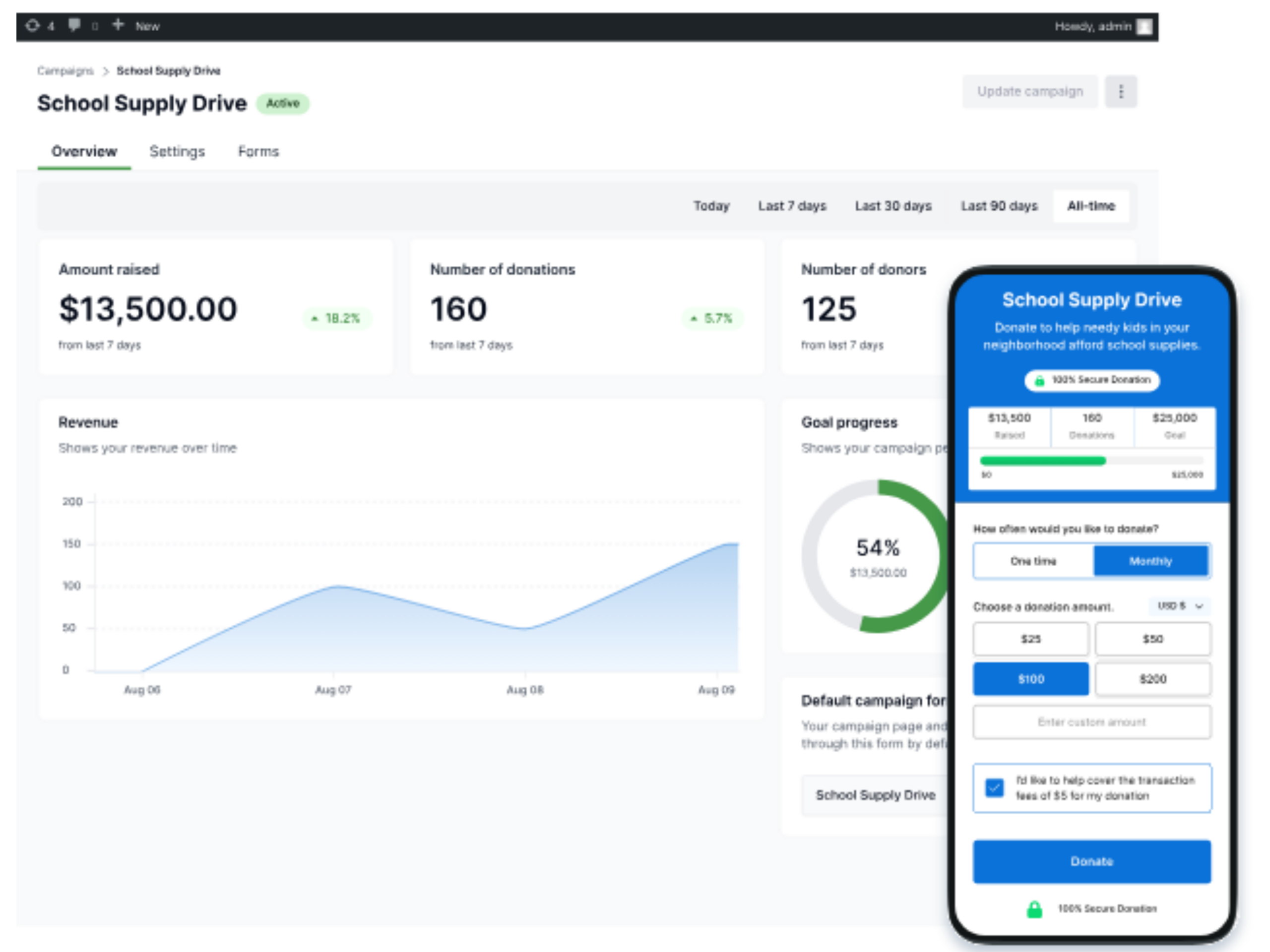 Campaigns Create goal-driven fundraising campaigns with progress tracking.